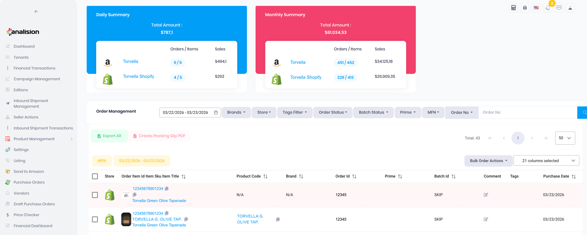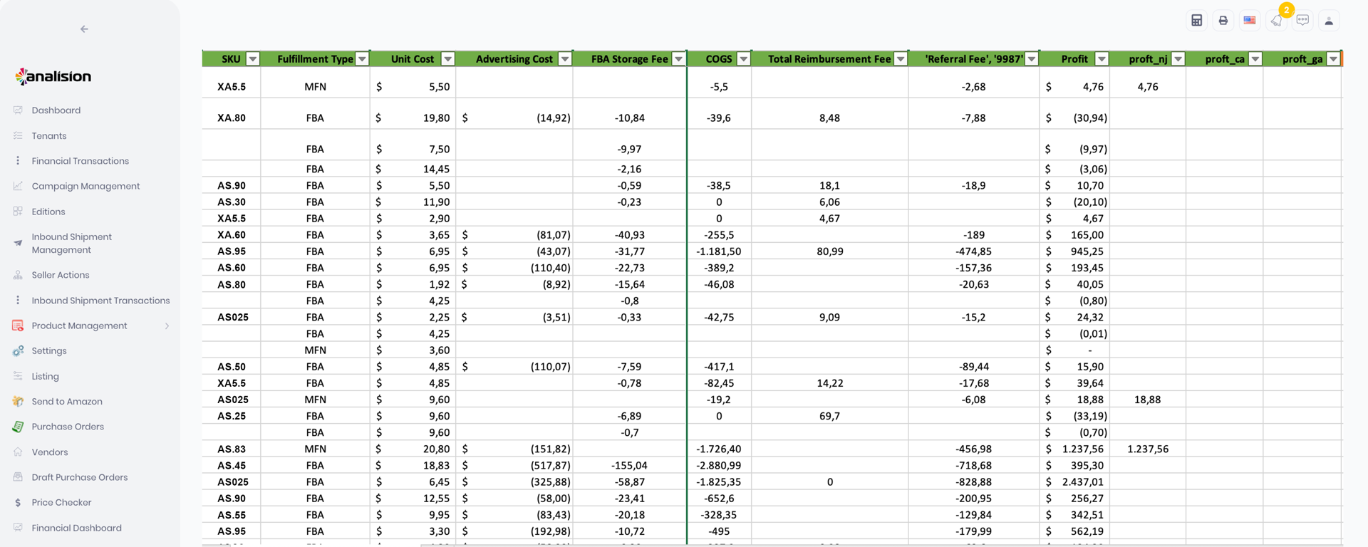 Analision tracks real profit after all fees, costs, and ad spend. Make inventory and fulfillment decisions with profit context, not just operational metrics.