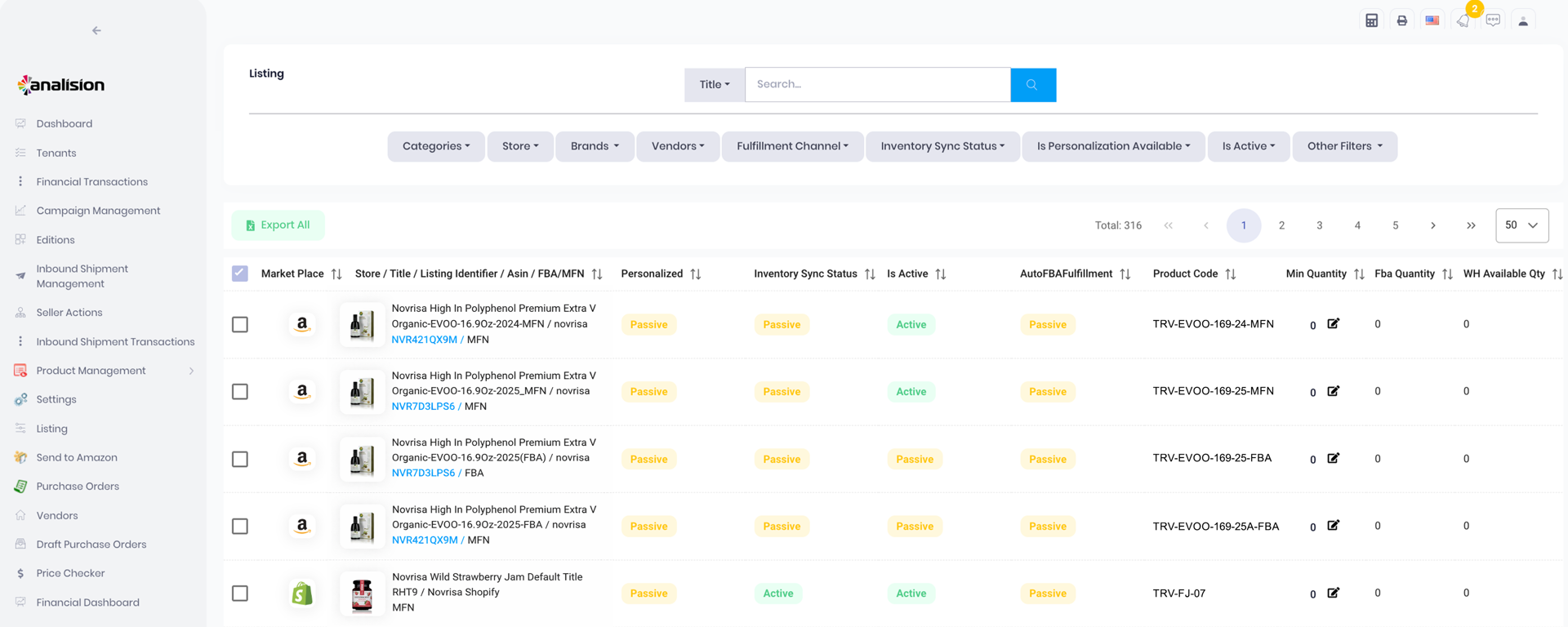 Analision syncs inventory in real-time across all channels. Set reorder points, track inbound shipments, and get alerts before you run out. No more overselling or stockouts.